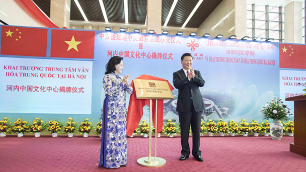 中共中央總書記、國家主席習近平12日在河內(nèi)出席越中友誼宮落成移交儀式暨河內(nèi)中國文化中心揭牌儀式。