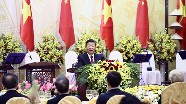 中共中央總書記、國家主席習近平12日出席越共中央總書記阮富仲和越南國家主席陳大光在河內(nèi)國際會議中心舉行的隆重歡迎宴會。
