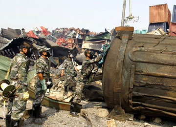 2015年8月16日,天津濱海新區(qū)危險品倉庫爆炸進入第五天,中國人民解放軍北京軍區(qū)某部防化團防化兵對爆炸核心區(qū)周邊開展化學(xué)污染檢測工作。
