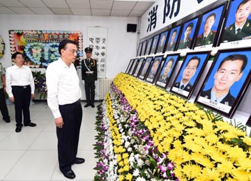 李克強16日下午來到天津濱海新區(qū)臨時靈堂,向“8.12”火災(zāi)爆炸事故中犧牲的消防人員默哀并三鞠躬。