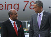7月29日美國總統(tǒng)奧巴馬結(jié)束為期5天的非洲之行,從埃塞俄比亞首都亞的斯亞貝巴的博樂國際機(jī)場搭乘空軍一號離開。埃塞俄比亞總理德薩萊尼到機(jī)場為奧巴馬送行。兩人還在埃塞俄比亞航空公司首席執(zhí)行官格布樂馬里亞姆陪同下,參觀了停機(jī)坪上的波音夢想飛機(jī)。