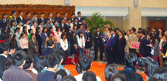 中國(guó)日?qǐng)?bào)網(wǎng)環(huán)球在線消息:“平等中尋覓摯友,以誠(chéng)實(shí)營(yíng)造自我,你是中國(guó)!”在外交部橄欖廳,李肇星部長(zhǎng)滿懷深情地朗誦起他的詩《青春中國(guó)》。圍繞在他身旁的是來自北京大學(xué)、清華大學(xué)、中國(guó)人民大學(xué)、北京師范大學(xué)、北京外國(guó)語大學(xué)、外交學(xué)院、國(guó)際關(guān)系學(xué)院、北京語言大學(xué)、對(duì)外經(jīng)濟(jì)貿(mào)易大學(xué)、中國(guó)政法大學(xué)、中國(guó)傳媒大學(xué)、北京第二外國(guó)語學(xué)院等12所首都高校的180多名大學(xué)生,他們正興致勃勃地參加外交部舉辦的首次大學(xué)生專場(chǎng)“公眾開放日”活動(dòng)。