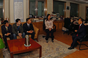 這次活動(dòng)給學(xué)生們的最大驚喜是,幾名代表應(yīng)邀走進(jìn)李部長(zhǎng)的辦公室。“歡迎你們,但我這里很雜亂,真是對(duì)不起!”李部長(zhǎng)親切地與同學(xué)們握手,一下子打消了大家的拘謹(jǐn)?!澳銈兩蠋啄昙?jí)啦?”“大四,我正準(zhǔn)備報(bào)考外交部呢!”“家人同意嗎?”“爸媽很支持?!薄澳桥笥淹鈫幔俊薄拔蚁朐谕饨徊空覀€(gè)女朋友。”和藹的主人與年輕的客人輕松地聊起家常,李部長(zhǎng)辦公室里不時(shí)響起歡快爽朗的笑聲。