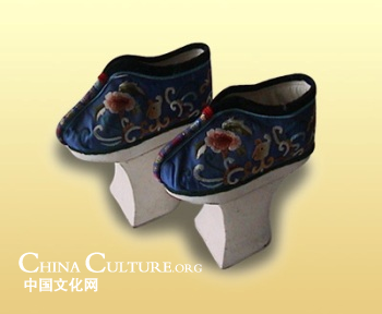 Lily feet refers to women's bound feet. The origin of lily feet is not very certain. It is often said that it appeared during the Five Dynasties (907–960). According to legend, a king asked a lady-in-waiting named Ruiniang to bind her feet and dance on a golden lotus flower, so it was called three-inch lily feet. After that, the custom of foot-binding emerged. But this custom ceased after the founding of New China, and shoes for lily feet entered the museums. There is another story about lily feet. The king of the Sui Dynasty (581–618) was immoral. When he traveled along the river, he did not want to use men to tow his boat, so he chose 100 beautiful women. A blacksmith’s daughter, Wu Yueniang, was one of them. She bound her feet and hid a small sword inside. She wore very beautiful small shoes with lotus flowers which attracted the king's attention. When the king came closer to look, Wu Yueniang drew out the sword and stabbed the king's arm. Wu Yueniang failed to kill the king; then she jumped into the river and killed herself. From then on, women began binding their feet to memorialize Wu Yueniang.