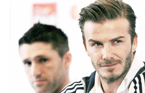 Los Angeles Galaxy's David Beckham reacts during a news confrence in Jakarta November 28, 2011.