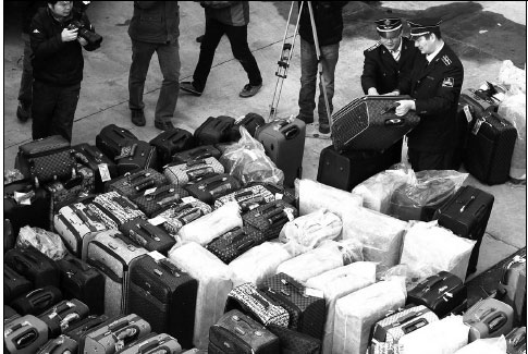 Law enforcement officers from Shanghai's quality supervision authority confiscate a shipment of counterfeit bags and suitcases.Wang Chen / For China Daily