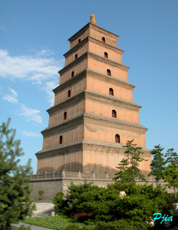 Preserved on the four stone doors in the base of the pagoda are exquisite engravings of the Tang. Two steles withthe Preface to the Sacred Religionwritten by the famous Tang calligrapher Chu Suiliang are set into the walls on the either side of the south door of the pagoda. On the forehead of the west stone gate, there are carved with architecture joss patterns and pictures, which are in compact layout, with vigorous and smooth lines, and are said to be the works of Yan Liben and Yu Chiyi, famous painters of the Tang Dynasty, so that these patterns and pictures become the significant material for Chinese ancient architecture research.
