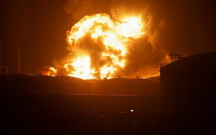 A big blaze is seen following an explosion triggered by leaked chemical facility at a PX plant in Gulei Peninsula in Zhangzhou city, Fujian province, April 6.
