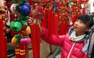 Customers select decorations to celebrate Spring Festival at a market in Wuyishan city, Fujian province.