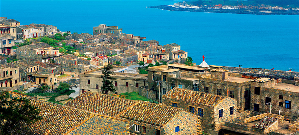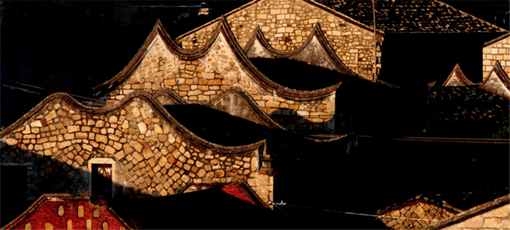 • Wave-shaped rooftops of stone houses on Dongxiang Island