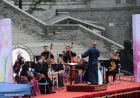 A woman plays Guzheng, a 21 or 25-stringed plucked instrument, at a site of an activity for the Qingming cultural week in Guiyang.