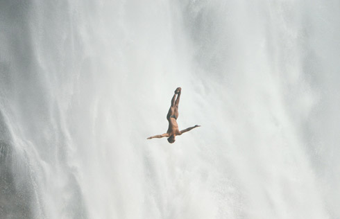 Contestants dive during the Vita Coco Waterfall Diving competition at Chishui Waterfall in Chishui city, southwest China's Guizhou province, October 22, 2016.