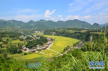 A yellowish-green slither of farmland sits beside Hongdu River in Changqi ancient village as it meanders through the valley. Changqi is Located in the jurisdiction of the famous red tourism city of Zunyi in Guizhou province.