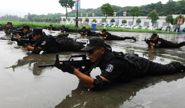 Special policemen perform military skills for citizens during the activity of the "police station opening day" in Xiangfan City, central China's Hubei Province, July 22, 2010. A total of 30 students and parents visited the special police detachment of Xiangfan police for the first time on Thursday. The activity of "police station opening day" helped enhance children's awareness of national defence and their understanding of special police during the summer vacation. (Xinhua/An Fubin)