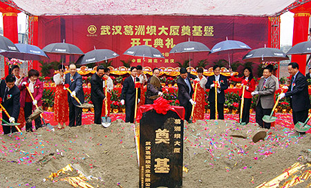 Yang Jixue, president of CGGC and chairman of China Gezhouba Group Co, announced the GC Tower broke ground and the International Plaza opened. Ding Yanzhang, president of the Company, addressed the ceremony. Chen Bangfeng, vice president of the Company, chaired the ground-breaking ceremony for GC Tower, and Zeng Zimo, a famous hostess of Hong Kong-based Phoenix Television, chaired the opening ceremony for the International Plaza.