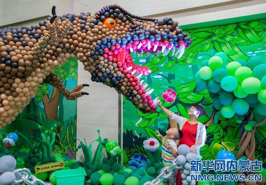 A boy poses with a balloon dinosaur in Inner Mongolia’s Hohhot, where a "Jurassic Park" built with over 200,000 balloons opened on July 14. [Photo by Ding Genghou/Xinhua]