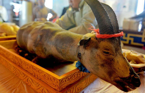 A stone-made roast lamb is seen during a traditional Sonid meat fair in Sonid Left Banner, North China's Inner Mongolia autonomous region, July 5, 2015.
