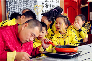 Li Qingwu, a fifth-generation inheritor of Mount Tai sugar painting created a great sensation for kids at Qili Primary School in Tai'an, Shandong province during his visit to the school on Oct 24.