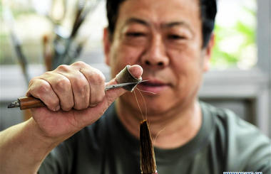 Guo Mingchang, a successor of Qi writing brush making technique, trims a product in Dawang township of Guangrao county, East China's Shandong province, June 4, 2017.