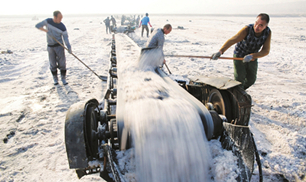 Workers shovelled mirabilite onto a conveyer belt at the salt fields of Yanhu Lake in Yuncheng city, Shanxi province, Jan 14.