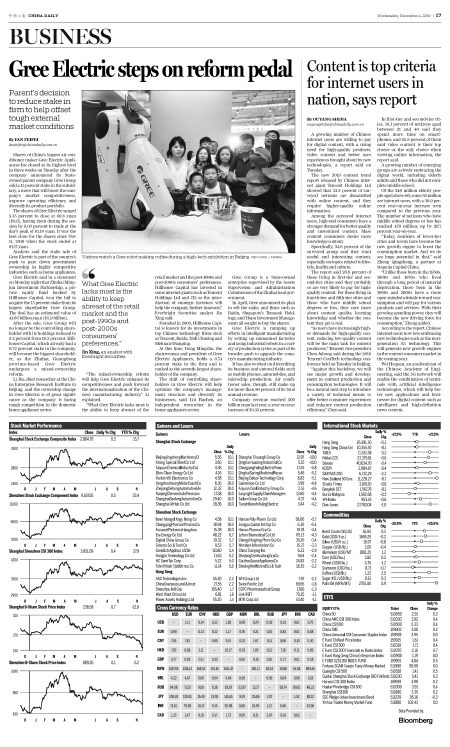 Shares of China's largest air conditioner maker Gree Electric Appliances Inc closed at its highest level in three weeks on Tuesday after the company announced its State-owned parent company Gree Group sold a 15 percent stake in the subsidiary, a move that will boost the company's market competitiven