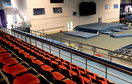 A photo taken on May 19, 2008, shows the temporary seats in the University of Aeronautics & Astronautics Gymnasium. As a renovated venue, University of Aeronautics & Astronautics Gymnasium will be used to hold weightlifting competitions during the Olympic and Paralympic Games. [Xinhua]