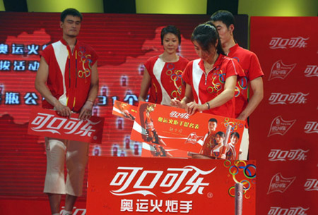 Diving player Guo Jingjing signs her name to promote upcoming Olympic torchbearers selection event. Beijing 2008 Olympics sponsor Coca Cola holds a news conference to promote upcoming Olympic torchbearers selection event, which Chinese NBA star Yao Ming(L), diving player Guo Jingjing(R),and top table tennis player Wang Liqin,second right, attend on July 3rd, 2007 in Beijing.[sina.com]
