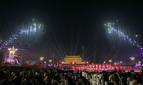 Fireworks are lit up beside the Tiananmen Gate during a ceremony to mark the one-year countdown to the Beijing Olympic Games, in Beijing August 8, 2007. The Games begin on August 8, 2008. [Reuters]