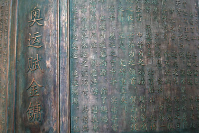 A huge Olympic bell is completed in Wuhan of central China August 8, 2007. The bell is 3.2 meters high and its diameter is 2.008 meters. It weights seven tons. An Olympic rhyme prose with 2008 Chinese characters is printed on it. [Xinhua]