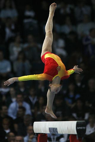 Cheng Fei of China performs a jump on the balance beam during the women's team final at the 40th World Artistic Gymnastics Championships in Stuttgart September 5, 2007. [Reuters]