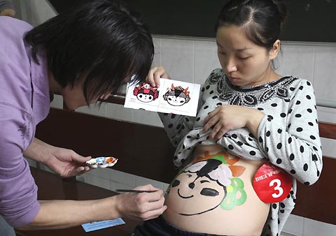 A pregnant woman gets a painting of Fuwa, the official mascot of the 2008 Beijing Olympics, during a body painting show in Xi'an, northwest China's Shaanxi province, September 8, 2007. [Reuters]