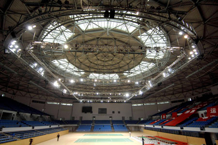 An interior view of the newly-built Beijing University of Technology Gymnasium, the venue for the Badminton and Rhythmic Gymnastics events in the 2008 Beijing Olympic Games. With an area of 24,000 sq m, the gymnasium is expected to seat 7,500 spectators. The 2007 International Badminton Invitation Tournament, one of the "Good Luck Beijing" test events, will be held here October 10-14, 2007. [Xinhua]
