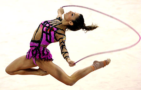 A Spain gymnast competes using the rope during during the individual all-round qualifications at the 2007 Rhythmic Gymnastics International Invitational Tournament held in the Beijing University of Technology Gymnasium, December 5, 2007. A total of 26 test events will take place this year at the various venues where next year's Beijing Olympic Games will be held. [Xinhua]