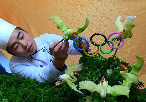 Wang Lianhou, a sculptor in Northeast Heilongjiang Province, presents his Olympic-themed work on December 7, 2007. All elements of this work are vegetables including carrots, Chinese melons and pumpkins. [newsphoto]