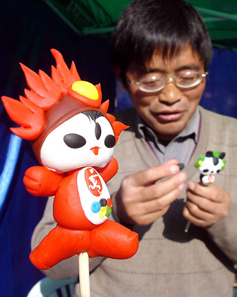 Folk artist Lu Shuhua works on a flour miniature in the shape of the mascots of the 2008 Olympic Games. [newsphoto]