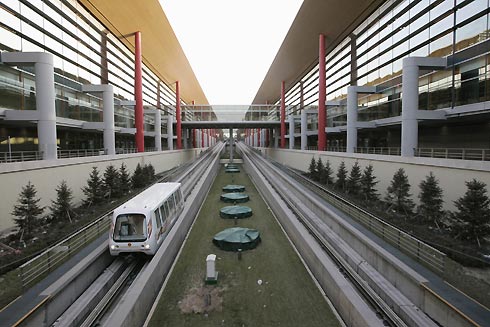 A shuttle train connecting the terminals is seen at the construction site of Beijing International Airport's new terminal on the outskirts of Beijing January 8, 2008. In preparation for a passenger surge during the 2008 Olympics this August, the newly-built No.3 terminal building at the main airport in Beijing has started getting ready for operations. [Agencies]