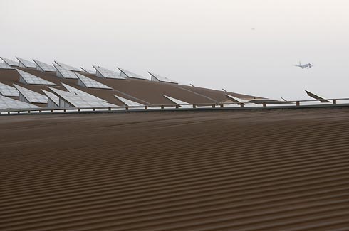 A plane flies past the construction site of Beijing's International Airport's new terminal on the outskirts of Beijing January 8, 2008. In preparation for a passenger surge during the 2008 Olympics this August, the newly-built No.3 terminal building at the main airport in Beijing has started getting ready for operations. [Agencies]