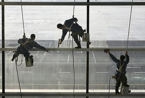Workers clean the glass inside the construction site of Beijing International Airport's new terminal on the outskirts of Beijing January 8, 2008. In preparation for a passenger surge during the 2008 Olympics this August, the newly-built No.3 terminal building at the main airport in Beijing has started getting ready for operations. [Agencies]
