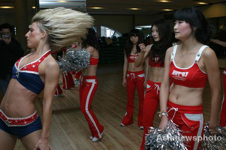 An American National Football League (NFL) cheerleader (L) gives a dance lesson to members of the Soojin Dance cheerleading squad at a gym in Beijing, January 12, 2008. The Soojin Dance cheerleading squad, which has performed at a few "Good Luck Beijing" pre-Olympic events, is hoping to appear at the upcoming Beijing Olympic Games. [Asianewsphoto]