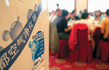 An air purifier at Quanjude Roast Duck Restaurant in Hepingmen helps dissipate the smell of nocotine. [China Daily]