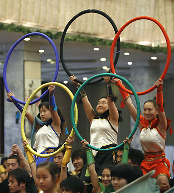 Performers hold the Olympic rings during a ceremony of the Beijing Workers union cheerleaders team at the Cultural Centre at the Shougang steel plant January 20, 2008, to celebrate the 200-day countdown to the Beijing Olympic Games. [Agencies]