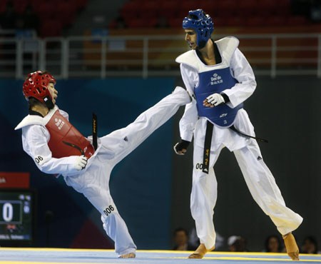 Japan's Kengo Uchimura (L) fights Australia's Safwan Khalil in the men's 58kg of Good Luck Beijing 2008 International Taekwondo Invitational Tournament at the University of Science and Technology Beijing Gymnasium in Beijing February 26, 2008. The gymnasium will hold the judo and taekwondo events in the XXIX Olympic Games in Beijing in August. [Agencies]