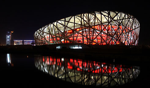 The National Stadium, or "Bird's Nest" is lit in colors at night and reflected in the water in Beijing, March 3, 2008.Managers of the 91,000-seat arena, which will host the opening and closing ceremonies at the summer Games, began trials on lighting the stadium. [Xinhua]