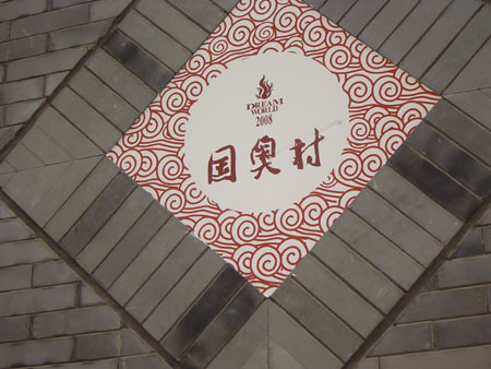 A tile bearing the name of the Olympic Village and lucky cloud design is seen outside the wall of an apartment building in this photo taken on March 5, 2008. The Organizing Committee for the Games of the 29th Olympiad (BOCOG) unveiled the village to the press on Wednesday. [chinadaily.com.cn]