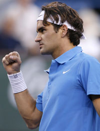 Switzerland's Roger Federer celebrates his victory over Spain's Guillermo Garcia-Lopez at the Pacific Life Open tennis tournament in Indian Wells, California March 16, 2008. [Agencies]