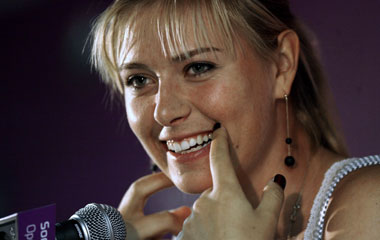 Maria Sharapova of Russia smiles during a news conference at the Sony Ericsson Open tennis tournament in Key Biscayne, Florida March 26, 2008. Sharapova has pulled out of the WTA Tour stop because of a shoulder injury. [Agencies]