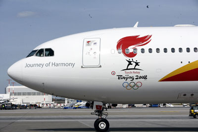 The Olympic Torch plane arrives in Athens of Greece on March 29, 2008. [Xinhua]