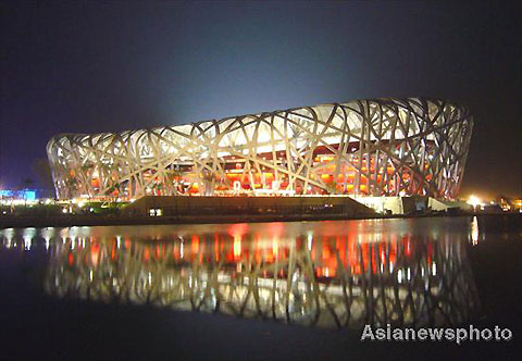 The National Stadium of China, also known as the Bird's Nest and the main venue holding the opening ceremony of the 2008 Olympics, conducts lighting tests in Beijing, April 13, 2008. [Asianewsphoto]