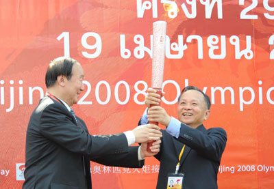 Jiang Xiaoyu (L), executive vice president of the Beijing Olympic organizing committee, hands the torch to Zhang Jiuheng, Chinese ambassador to Thailand, during the Thai leg of the Beijing Olympic torch relay in Bangkok on April 19, 2008. Bangkok leg, the 12th stop of the 2008 Beijing Olympic Games torch relay outside the Chinese mainland, concluded successfully Saturday. [Xinhua]