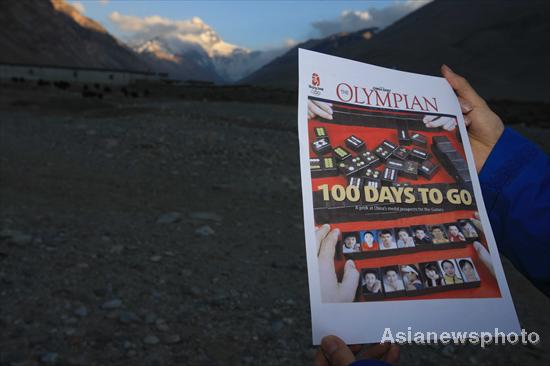Zhang Hongjiang, a stringer for China Daily, poses for a photo with an issue of Olympian of April 30 in his hands at the Qomolangma Base Camp Wednesday April 30, 2008, 100 days before the opening of the 2008 Beijing Olympics. [Asianewsphoto]